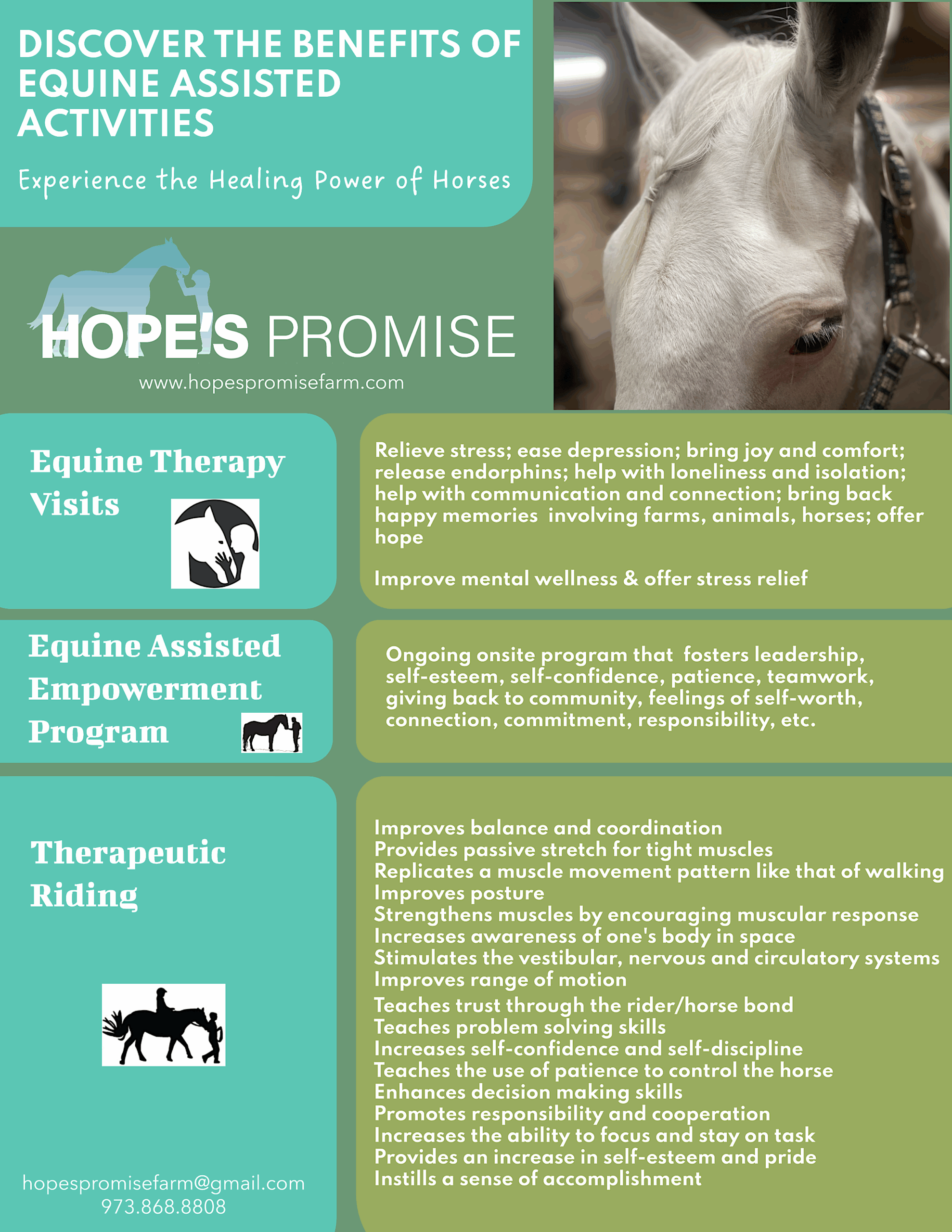 “Hope’s Promise is amazing. The feeling of serenity amongst the horses is incredible. Thank you Maureen for all you do in the community of Chester!”